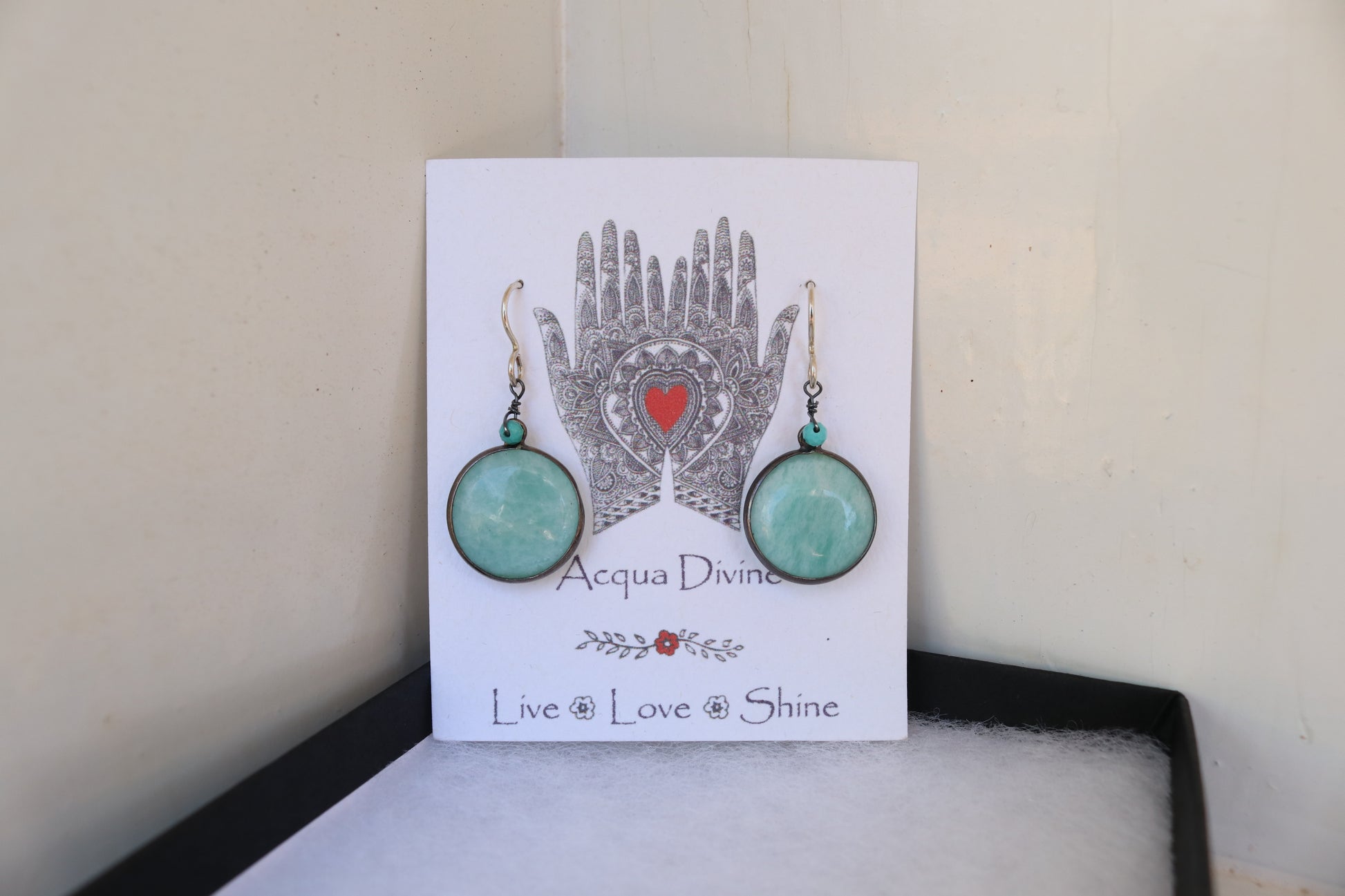 Amazonite stones sit within oxidized sterling silver bezels with silver hooks. All sterling silver is nickel free and hypoallergenic. Stones are .75 inches wide.