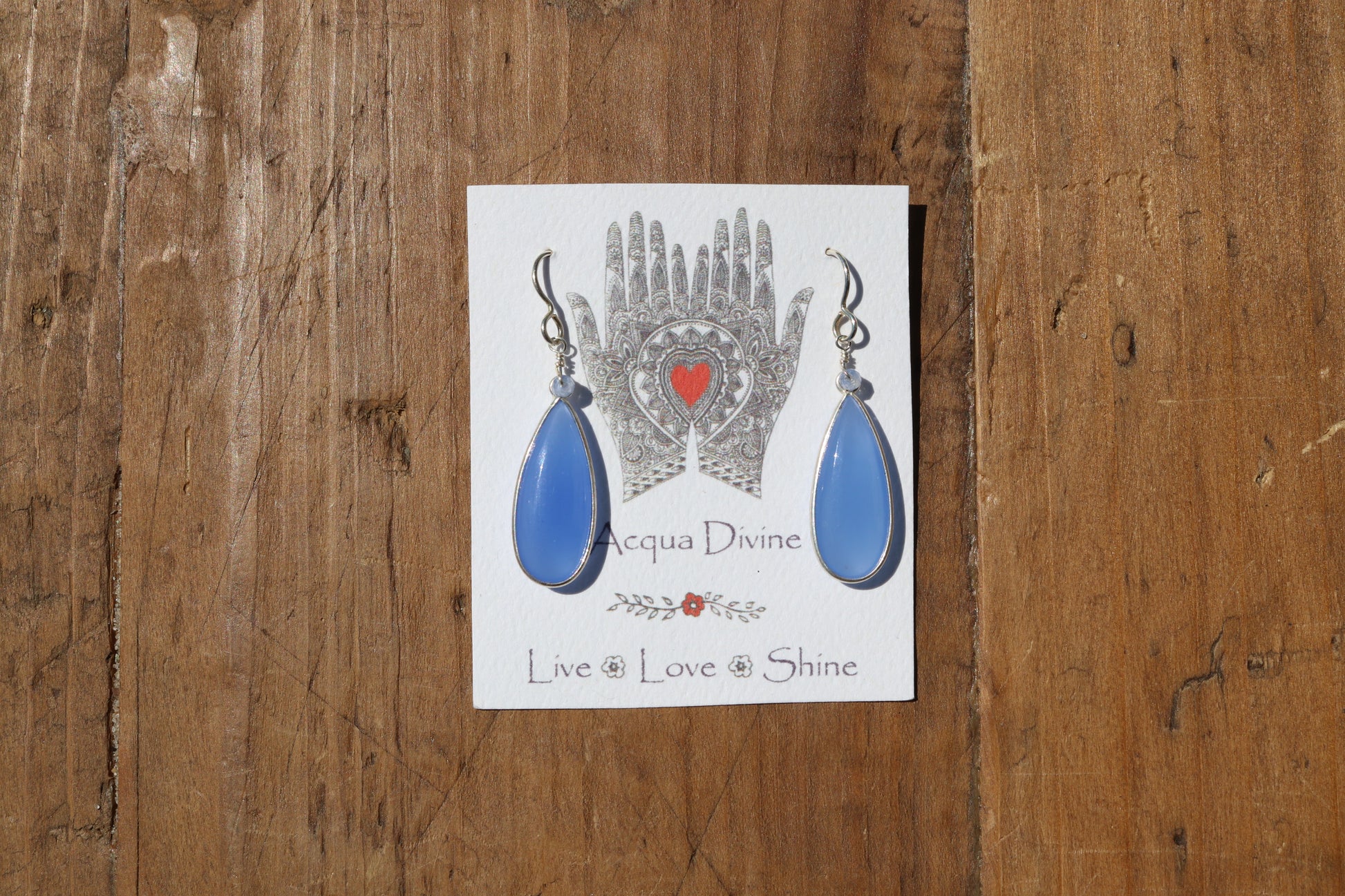 Blue chalcedony stones are embedded within sterling silver bezels with silver hooks. All sterling silver is nickel free and hypoallergenic. Stones are 1 inch long.