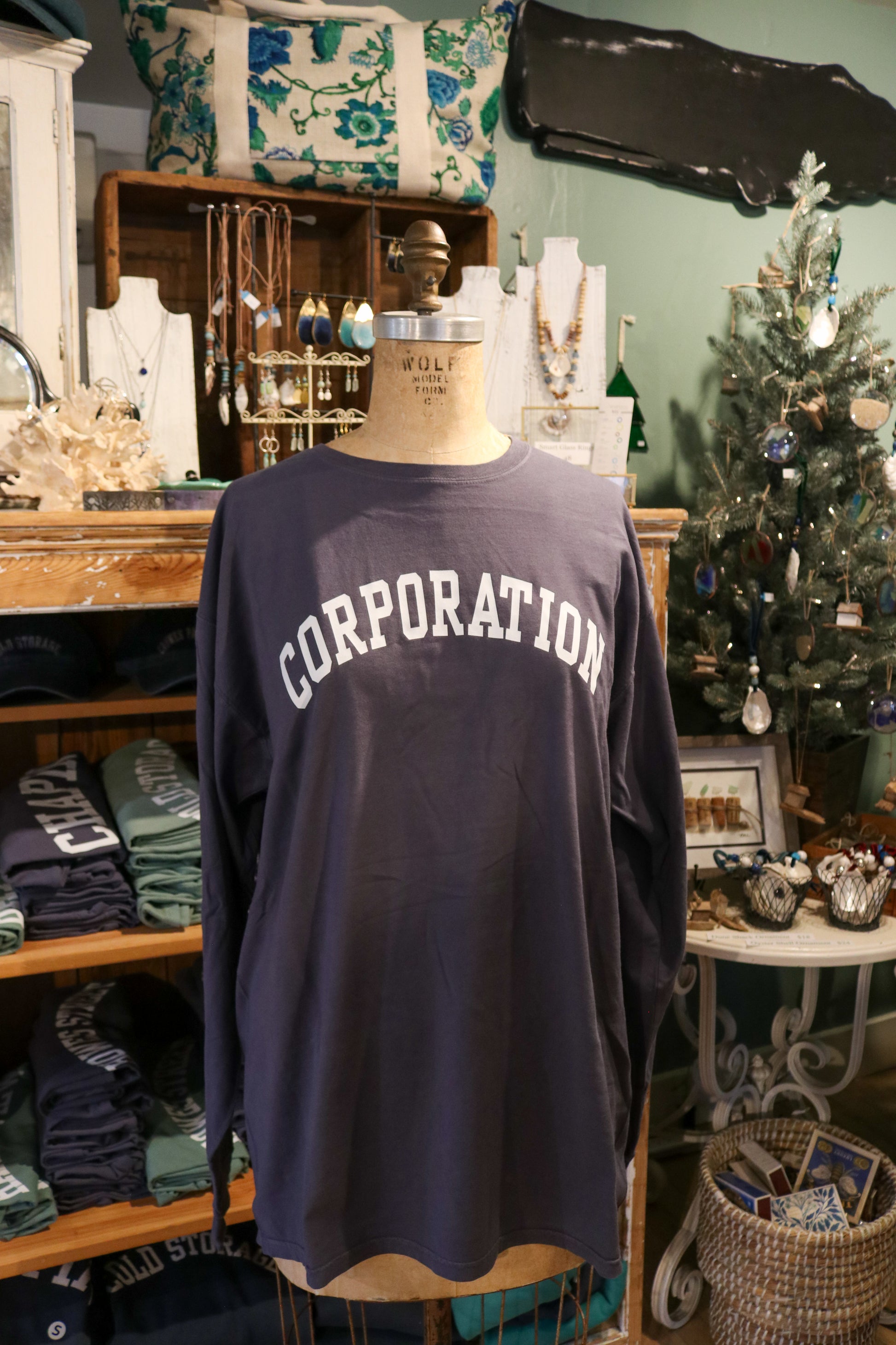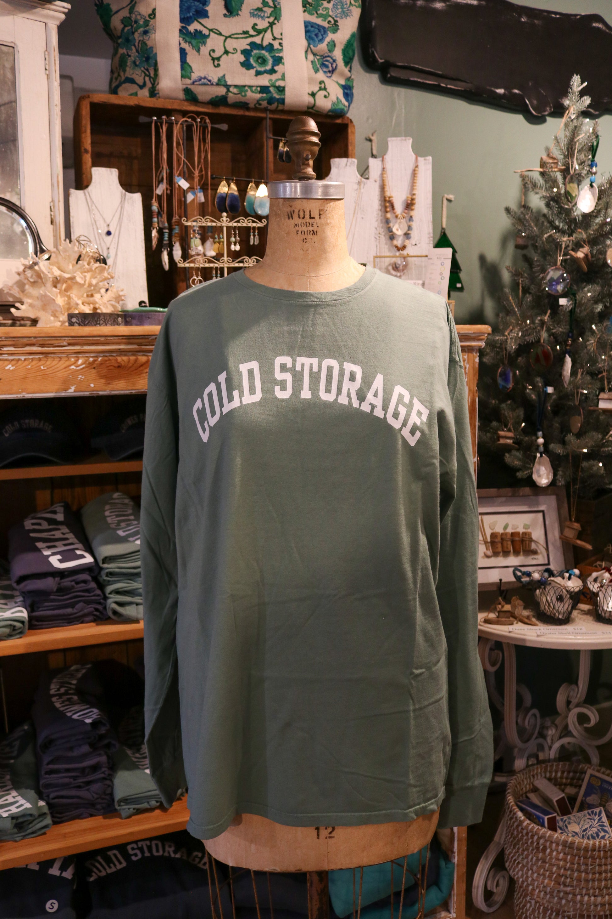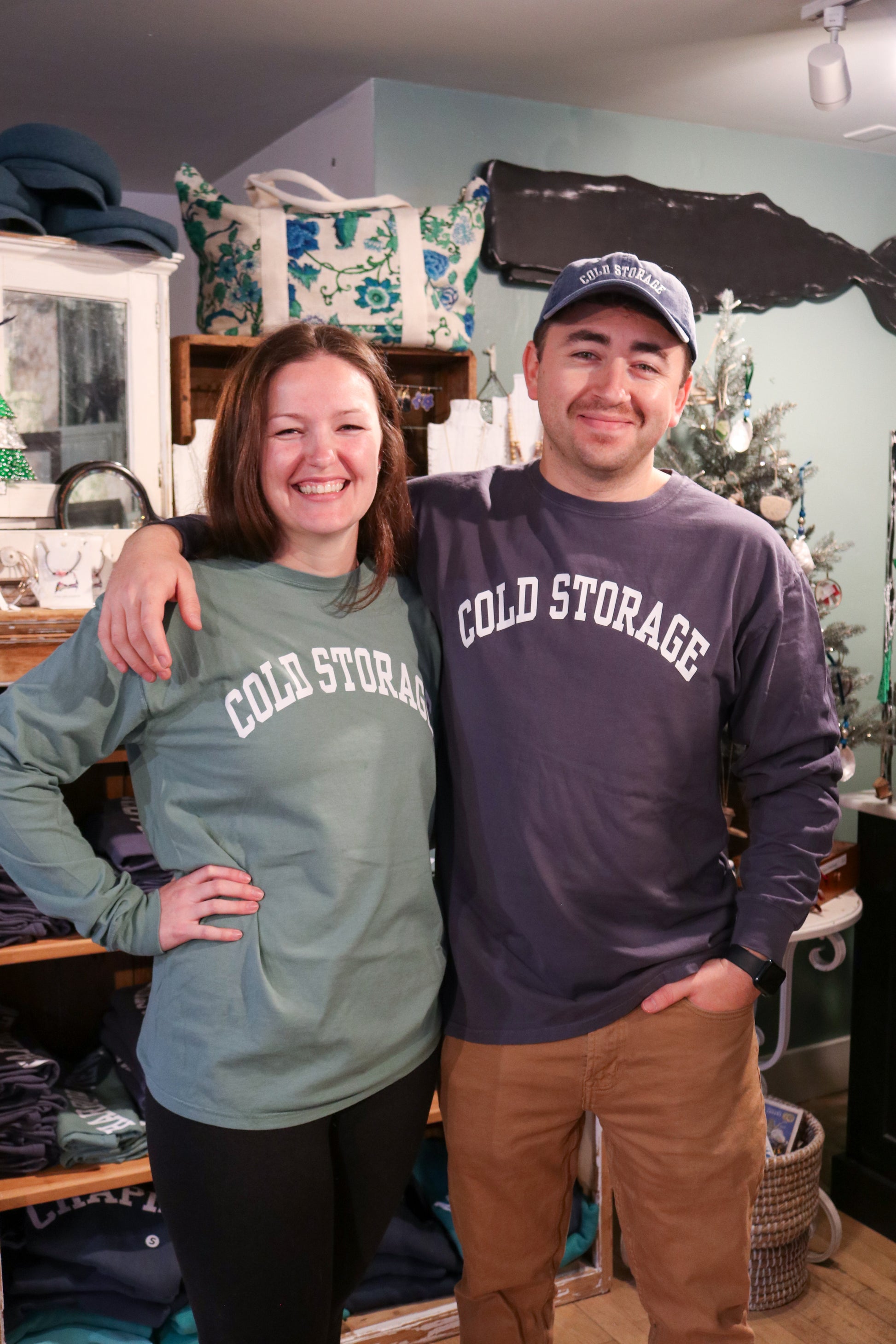 Sizes range from S to 2XL - Lily wears a Small in Sage Green and Sam wears a Medium in Navy Blue. All shirts are available in both colors and all sizes. On the mannequin, Bayview is Small, Chapin is Medium, Cold Storage is Large, and Corporation is XL. All other shirts on the mannequins are Medium.